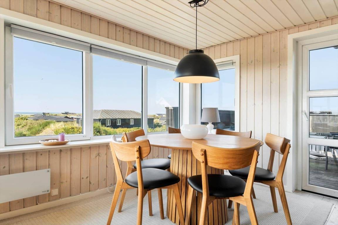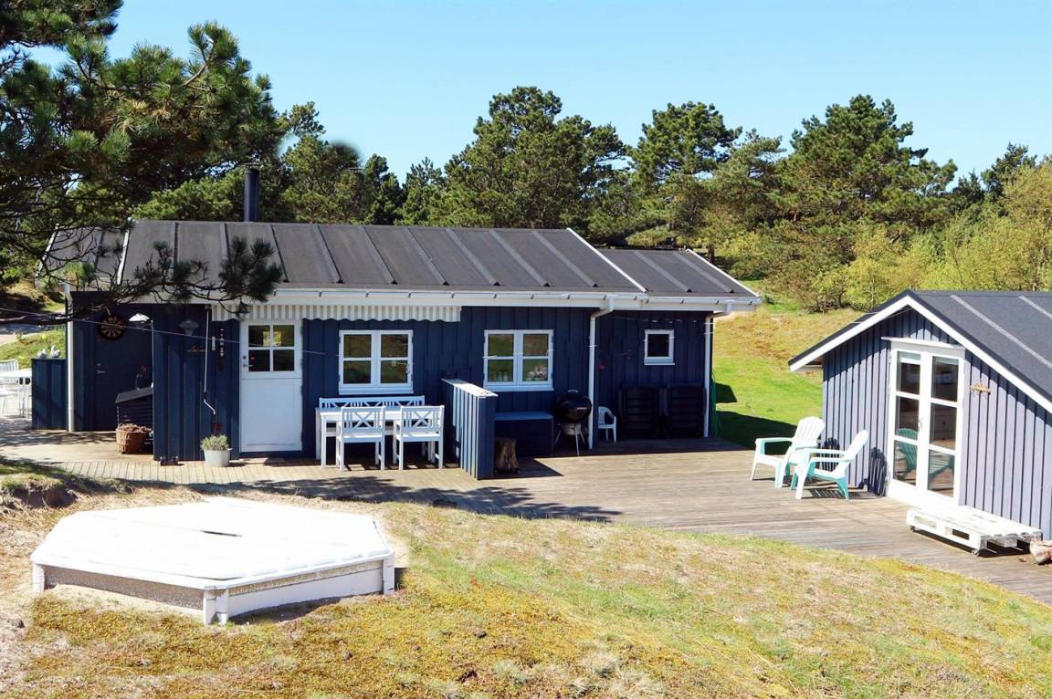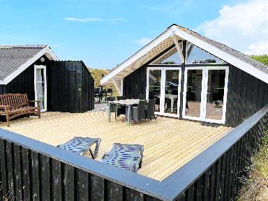 Schönes Ferienhaus mit herrlicher Lage dicht am Strand. Zum Haus gehören 3 Terrassen, in Richtung Osten, Westen und Süden gelegen. Die in Richtung Osten gelegene Terrasse ist zum Teil überdachte. Meeresblick von der Bank auf der Düne.
