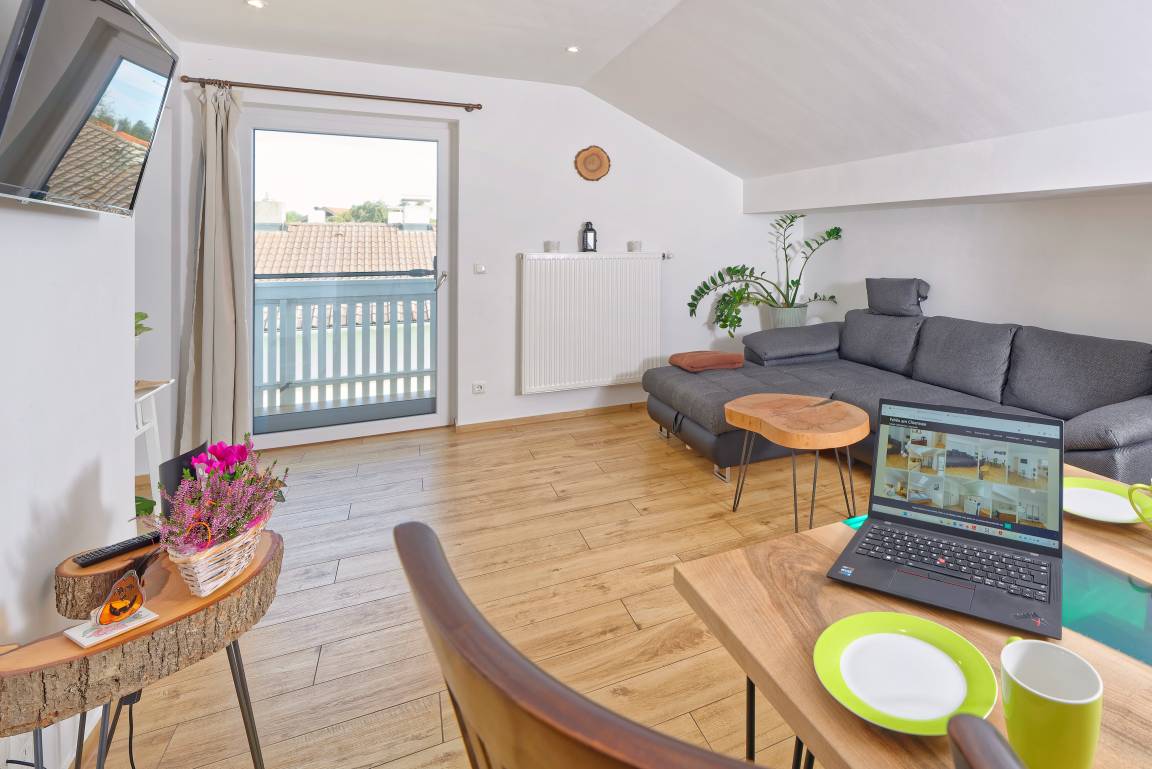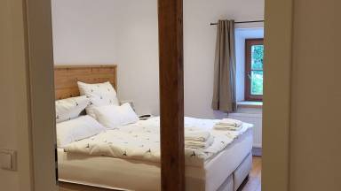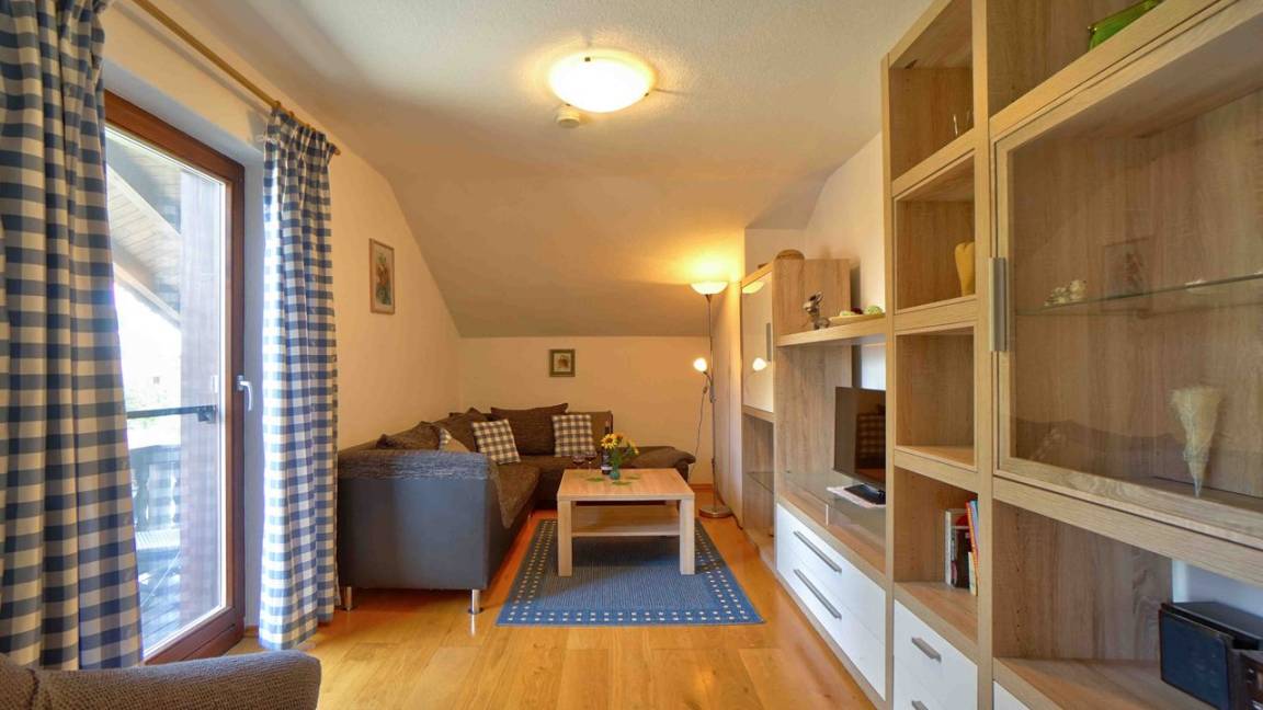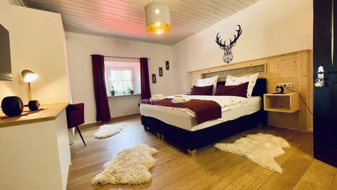 .Unsere Ferienwohnung 1 liegt im 1. Stock auf der Südseite des Hofes, mit direktem Blick auf den Chiemsee und die Chiemgauer Alpen. Die Ferienwohnung ist teilweise über dem Stall, daher kann man besonders in der Nacht, das Leben mit Tieren auf dem Bauernhof etwas miterleben/hören.