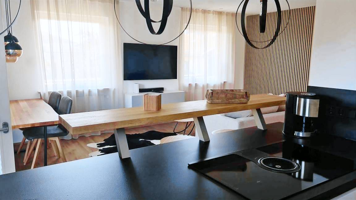 Dieses charmante Ferienhaus mit 125m² Wohnfläche inkl. Terrassen vereint großzügigen Komfort mit alpiner und mediterraner Gemütlichkeit. Eine separate, voll ausgestattete Küche lädt zum gemeinsamen Kochen ein, während der lichtdurchflutete Wohn- und Essbereich mit stillvollem Ambiente zum Entspannen und Genießen einlädt.
