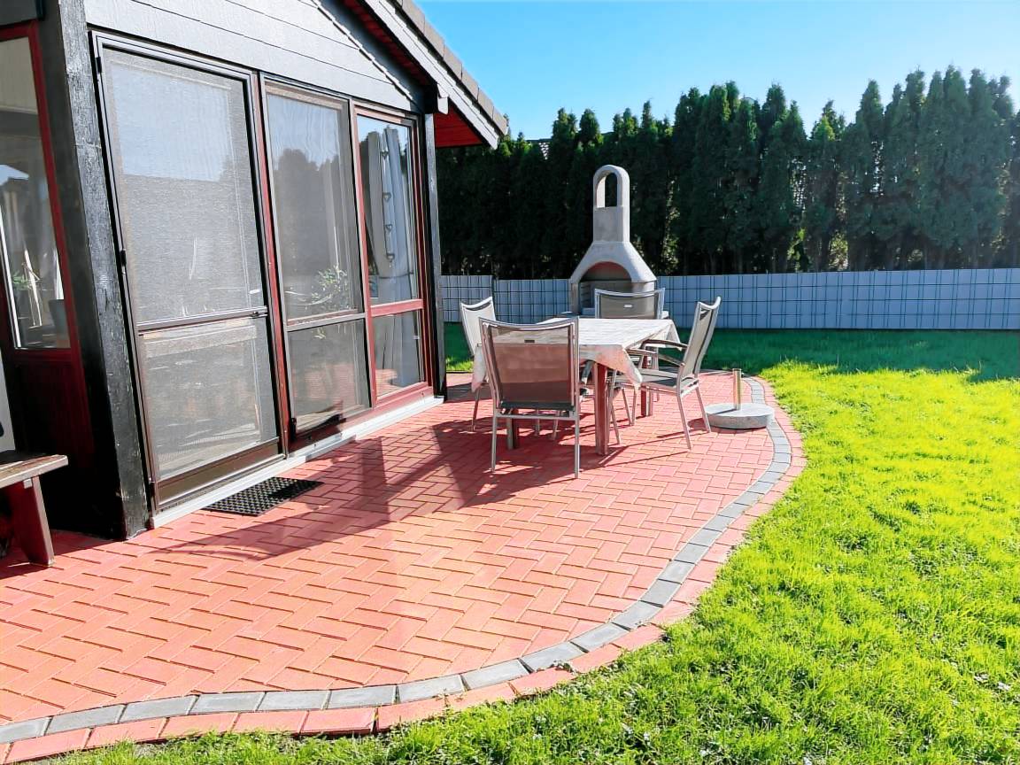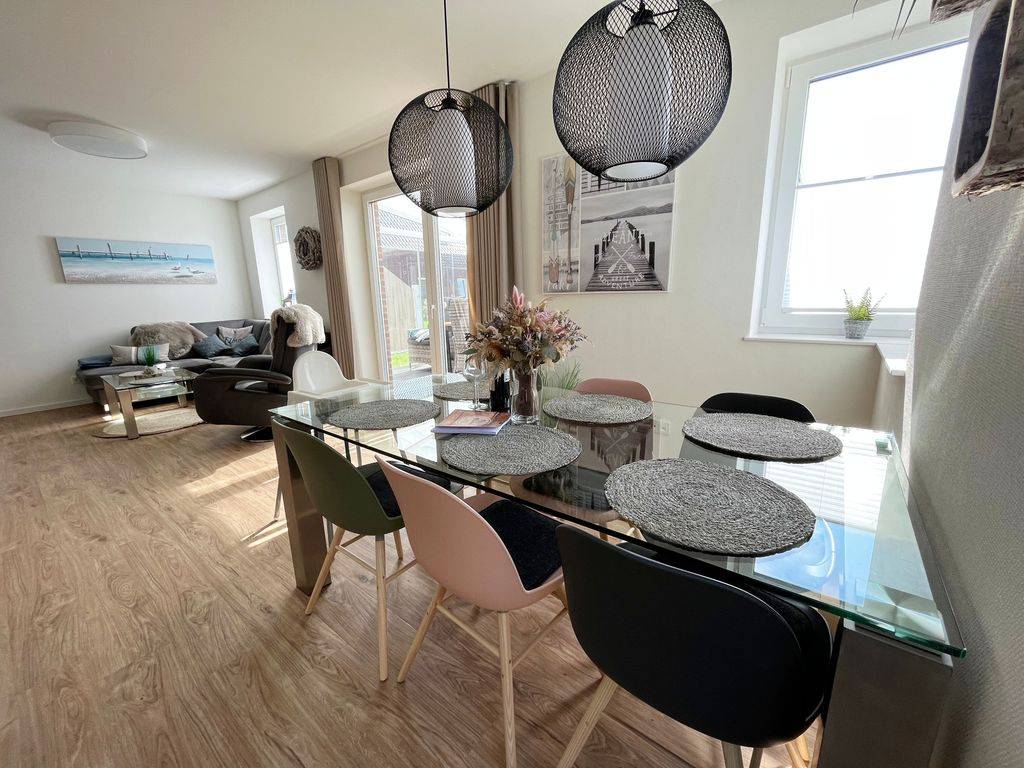 Das hochwertig ausgestattete Ferienhaus mit Wintergarten und Speckstein Kaminofen, Ledergarnitur, LCD-Fernseherim Wohnzimmer, 2. Fernseher im Wintergarten, Spül, Waschmaschine, Trockner und Außenkamin befindet sich auf einem 353 qm großen Grundstück. Das Haus befindet sich im Feriendorf Eckwarderhörne. Geschirr für mind. 12 Personen. 1 SAT-TV befindet sich im Wohnzimmer.