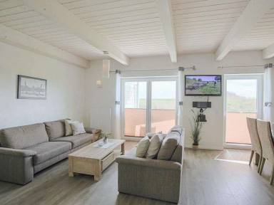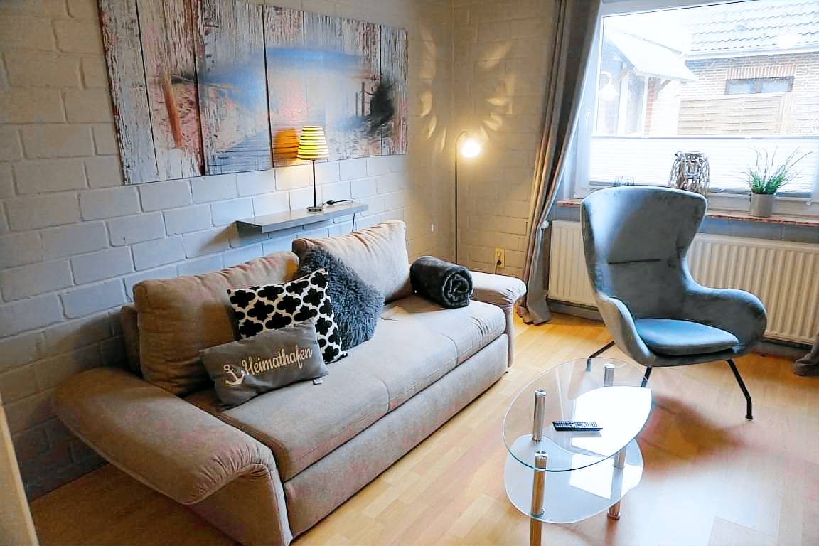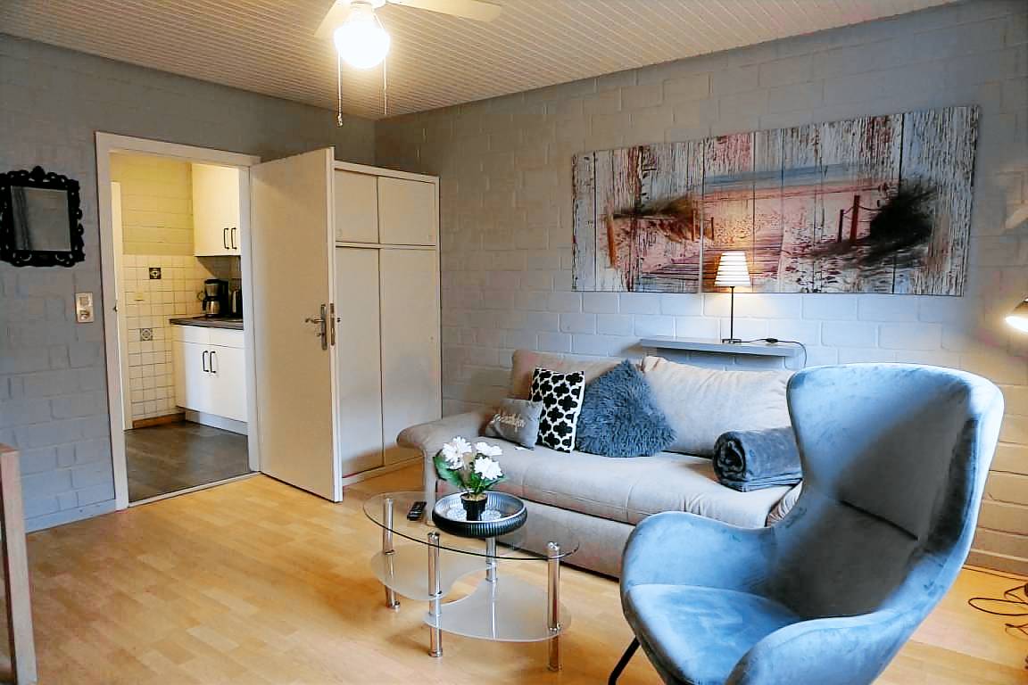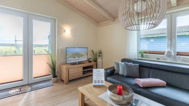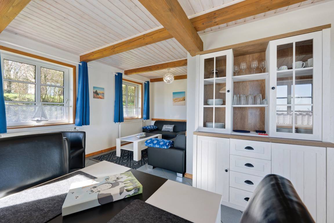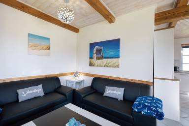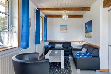 "Lachmöwe", 4-Zimmer-Doppelhaushälfte 100 m² auf 2 Stockwerken, im Erdgeschoss. Komfortabel und geschmackvoll eingerichtet: Wohn-/Esszimmer mit Schwedenofen und Sat-TV (Flachbildschirm), Radio und DVD. Ausgang zur Terrasse. 1 Zimmer mit 1 x 2 Etagenbetten. Offene Küche (Backofen, Geschirrspüler, 4 Glaskeramikplatten, elektrische Kaffeemaschine). Dusche/WC. Sep.