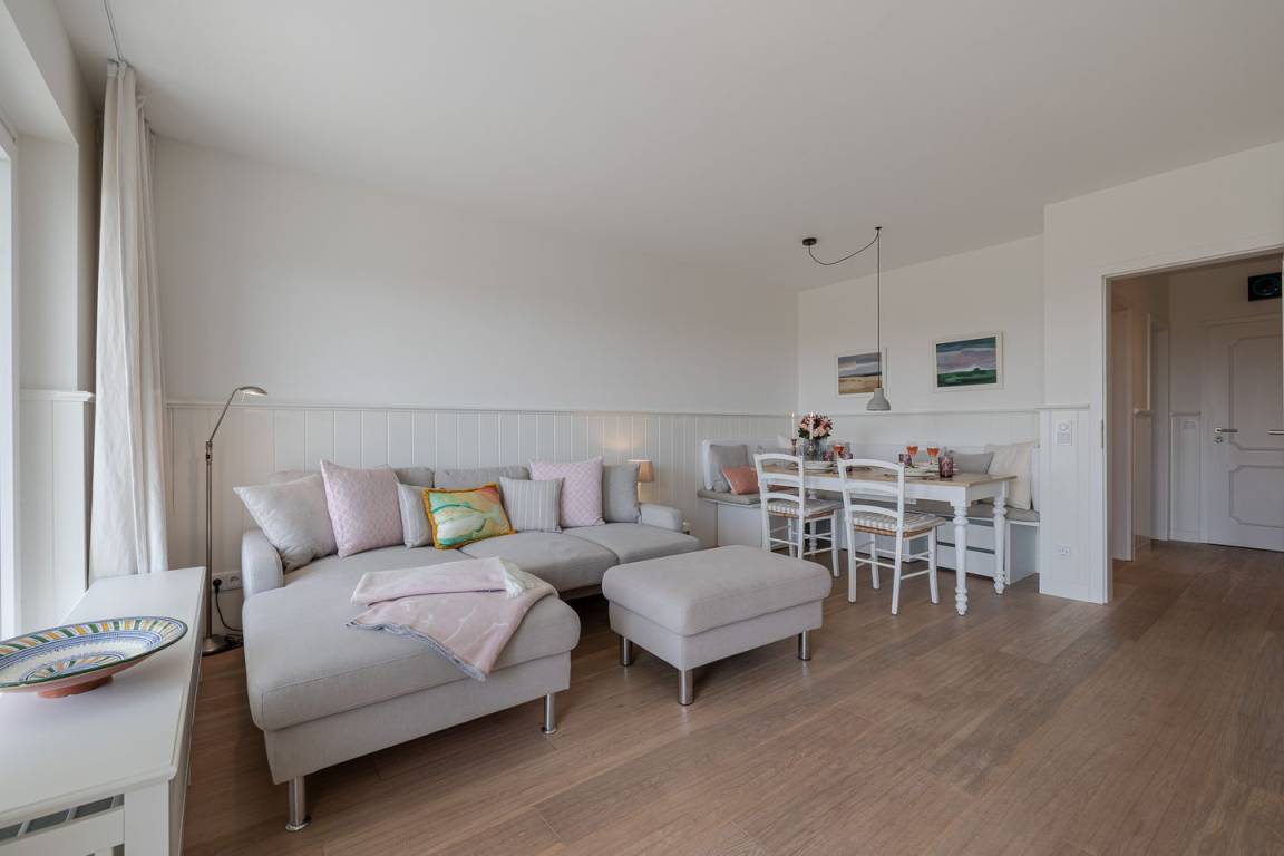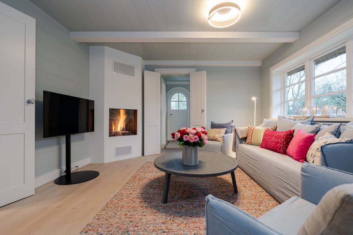 Sehr luxuriöse Ferienwohnung über zwei Etagen in einem Reetdachhaus mit großem Grundstück. Diese Ferienwohnung befindet sich in einem Reetdachhaus in ruhiger Lage im Süden von Tinnum auf der Insel Sylt. Die Ferienwohnung liegt im Süd/West-Flügel des Landhauses Treskersand und hat eine Wohnfläche von ungefähr 110 m². Im Erdgeschoss gibt es ein zusätzliches Gäste-WC.