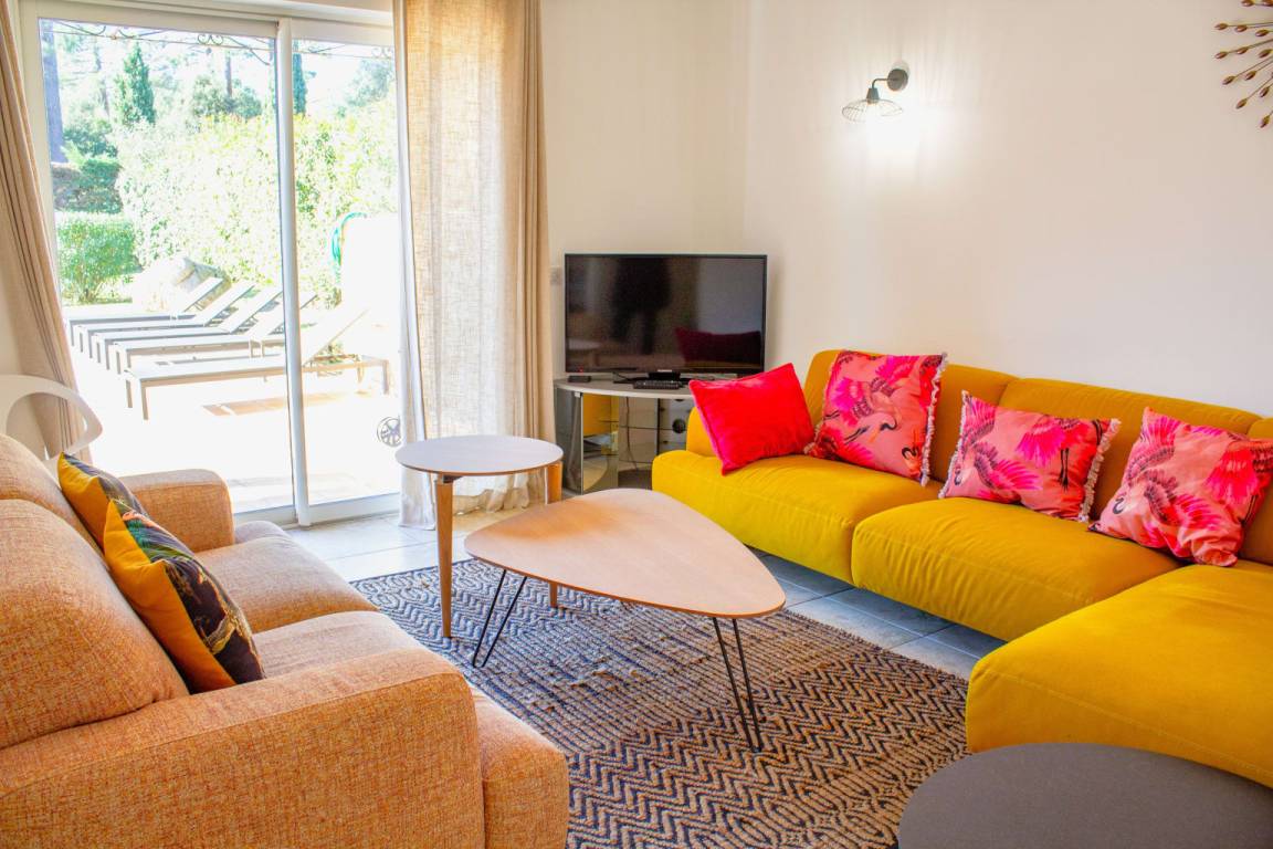 "Les Jardins d'Ève, F3", 3-Zimmer-Maisonette-Wohnung 75 m². Objekt geeignet für 4 Erwachsene + 2 Kinder. Komfortabel und modern eingerichtet: Wohn-/Esszimmer mit 1 Doppeldiwanbett (160 cm, Länge 190 cm), TV (Flachbildschirm). Ausgang zur Terrasse, zum Schwimmbad. Sep. WC. E-Heizung. Obergeschoss: 1 Zimmer mit 1 franz. Bett (160 cm, Länge 200 cm). E-Heizung.
