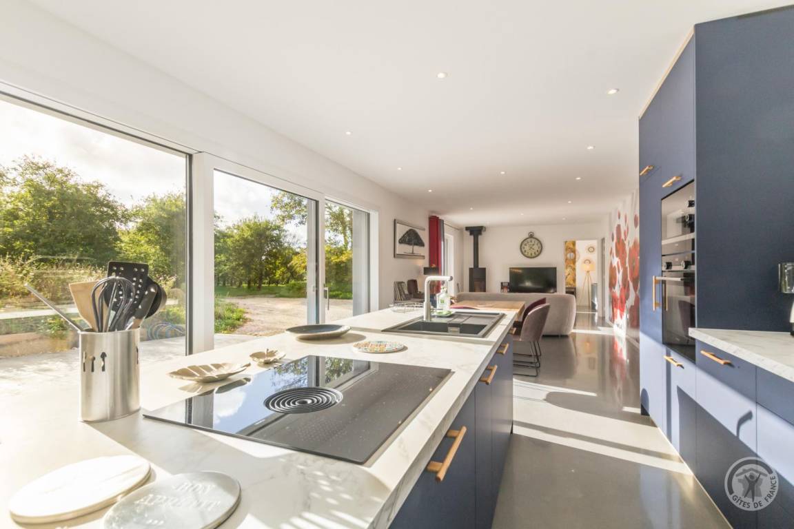 "L'Aventure Gouvillaise", 4-Zimmer-Haus 125 m². Komfortabel und modern eingerichtet: Wohn-/Esszimmer. 1 Zimmer mit 1 franz. Bett (160 cm, Länge 200 cm), Dusche. Offene Küche (Backofen, Geschirrspüler, 1 Induktionskochplatten, 4 Flammen, Toaster, Wasserkocher, Mikrowelle, elektrische Kaffeemaschine, Kapseln für die Kaffeemaschine (EXPRESSO)). Sep. WC. Rauchmelder.
