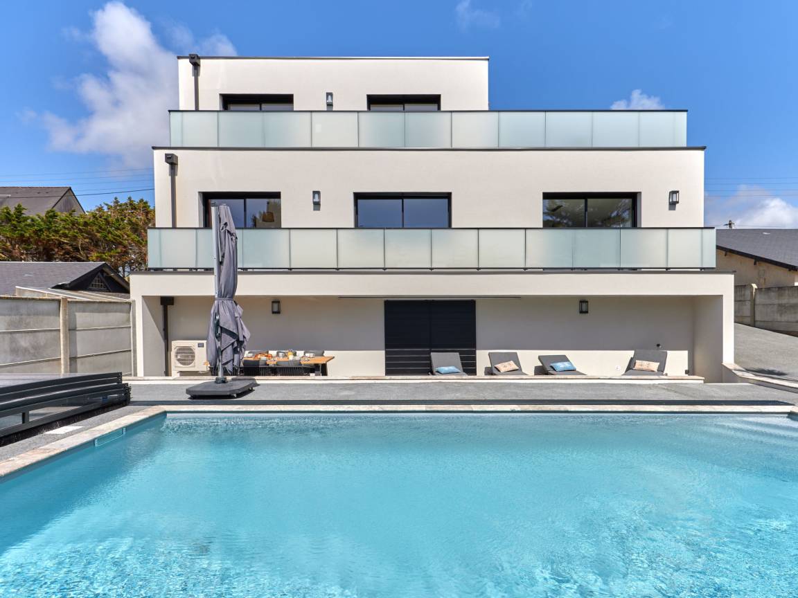"La Lucerie", 4-Zimmer-Haus 160 m² auf 2 Stockwerken. Modern und stilvoll eingerichtet: Wohn-/Esszimmer mit Esstisch, TV und DVD. Ausgang zur Terrasse. Küche (Backofen, Geschirrspüler, 4 Flammen, Toaster, Wasserkocher, Mikrowelle, Tiefkühler, elektrische Kaffeemaschine) mit kleinem Esstisch. Ausgang zur Terrasse. Sep. WC. Bodenheizung. Bett, Waschbecken und Dusche.