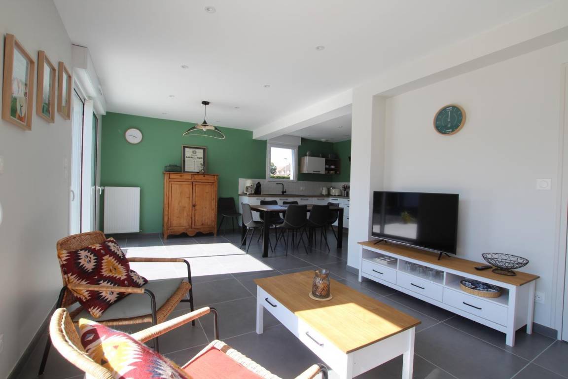 "Les sablons", 4-Zimmer-Haus 130 m². Schön und modern eingerichtet: Wohn-/Esszimmer mit TV (Flachbildschirm), Heizofen. 3 Zimmer, jedes Zimmer mit 1 franz. Bett (1 x 160 cm, Länge 200 cm) mit sep. WC. Offene Küche (Backofen, Geschirrspüler, 3 Induktionskochplatten, Toaster, Wasserkocher, Mikrowelle, elektrische Kaffeemaschine). Bad. E-Heizung. Natursteinboden.