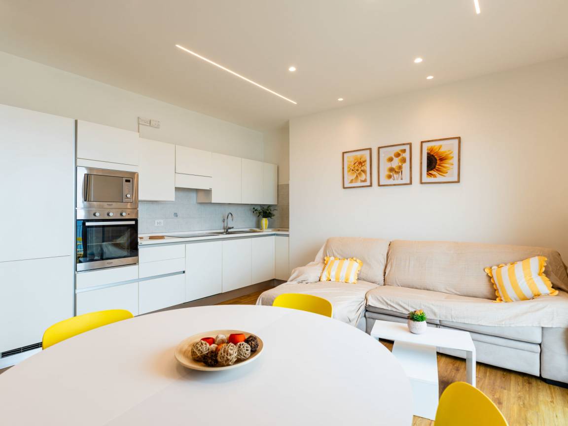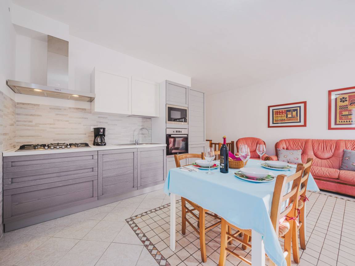 "Ginestra", 3-Zimmer-Wohnung 75 m², im Erdgeschoss. Modern und geschmackvoll eingerichtet: Wohn-/Esszimmer mit 1 Diwanbett (140 cm, Länge 200 cm), TV. Ausgang zum Balkon. 1 Doppelzimmer. 1 Doppelzimmer. Wohnküche (Backofen, Geschirrspüler, 4 Induktionskochplatten, Toaster, Wasserkocher, Mikrowelle, elektrische Kaffeemaschine). Ausgang zum Balkon. Dusche/Bidet/WC. 11.