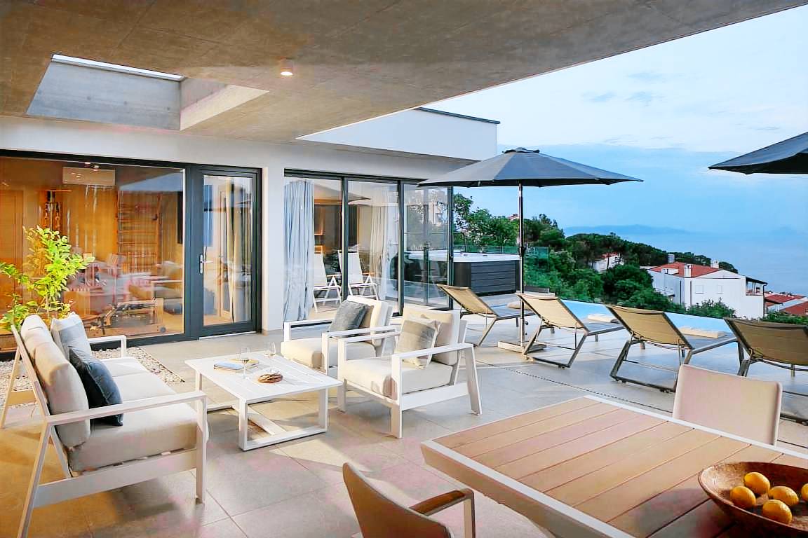 Die neue Villa Verde Horizon mit Blick auf die Adria und die Insel Cres ist so gebaut, dass sie luxuriösen Komfort sowie einen erholsamen und ruhigen Urlaubsaufenthalt bietet. Das klare Design zeichnet sich durch Zementwände, Holzböden, Möbel in Naturfarben, raumhohe Fenster und geschmackvolle Einrichtung aus. Für alle mit Wettbewerbsgeist gibt es dalmatinisches Balote.