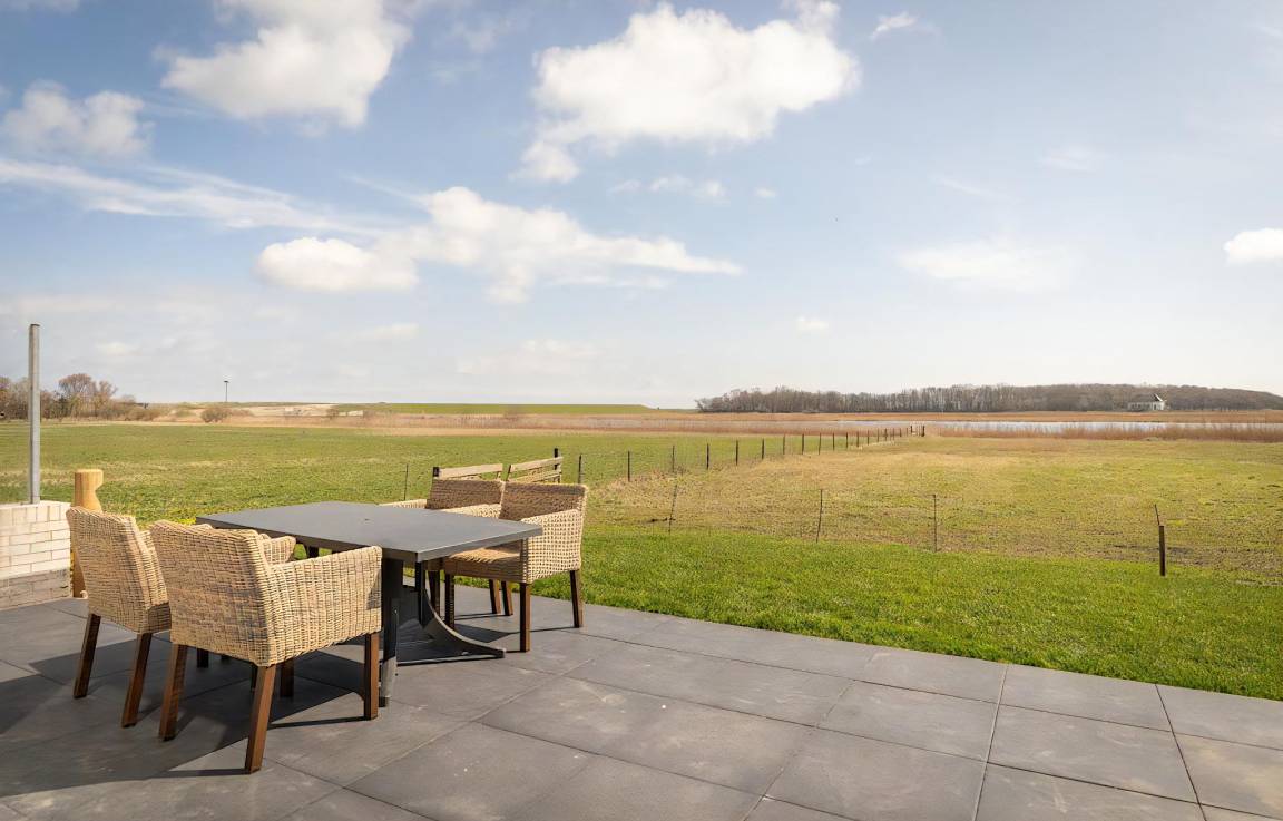 In einzigartiger Lage, in der Nähe des Waldes, der Dünen und des Strandes von Paal 17, finden Sie dieses nachhaltige, moderne Ferienhaus. Von den hohen Fenstern im Wohnzimmer und im Hauptschlafzimmer aus haben Sie einen tollen Blick über die Felder und die Landschaft von Texel.
