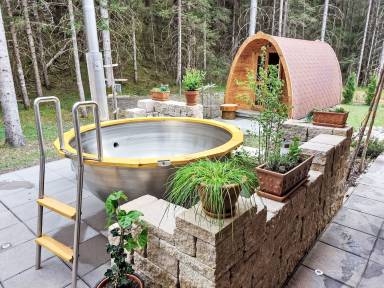 "Panoramablick", 4-Zimmer-Wohnung 125 m², im Erdgeschoss. Geschmackvoll und gemütlich eingerichtet: Eingang mit Esstisch. Wohnzimmer mit Sat-TV (Flachbildschirm). 2 Doppelzimmer. Wohn-/Schlafzimmer mit 1 x 1 Etagenbetten (90 cm, Länge 200 cm). Bad/WC. Ölheizung. Terrasse. Terrassenmöbel. Schöne Panoramasicht auf die Berge und den Wald. Rauchmelder.
