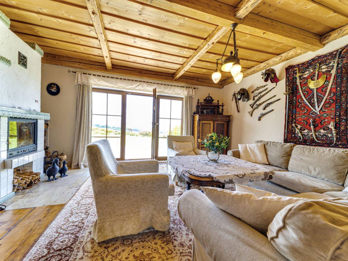 6-Zimmer-Haus 230 m² auf 2 Stockwerken. Rustikal und stilvoll eingerichtet: Eingang. Grosses Wohnzimmer 40 m² mit Panoramafenster mit 1 Doppeldiwanbett, offenem Kamin und Sat-TV (Flachbildschirm), Radio und DVD. Ausgang zur Terrasse. Grosses Esszimmer. Ausgang zur Terrasse. 1 Zimmer 18 m² mit 2 Betten (100 cm, Länge 200 cm). Terrasse.