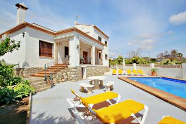 "Rosita", 6-Zimmer-Haus 326 m². Objekt geeignet für 6 Erwachsene. Rustikal und gemütlich eingerichtet: Wohn-/Esszimmer mit offenem Kamin, Esstisch, Bar, Digital-TV, Klimaanlage und Warmluftheizung. Ausgang zum Gartensitzplatz, zum Schwimmbad. Wohn-/Esszimmer mit offenem Kamin, Klimaanlage und Warmluftheizung. 2 Zimmer, jedes Zimmer mit 1 Bett (90 cm, Länge 190 cm).